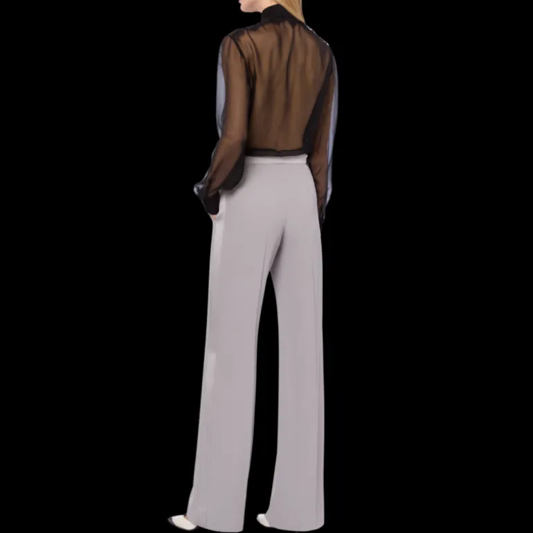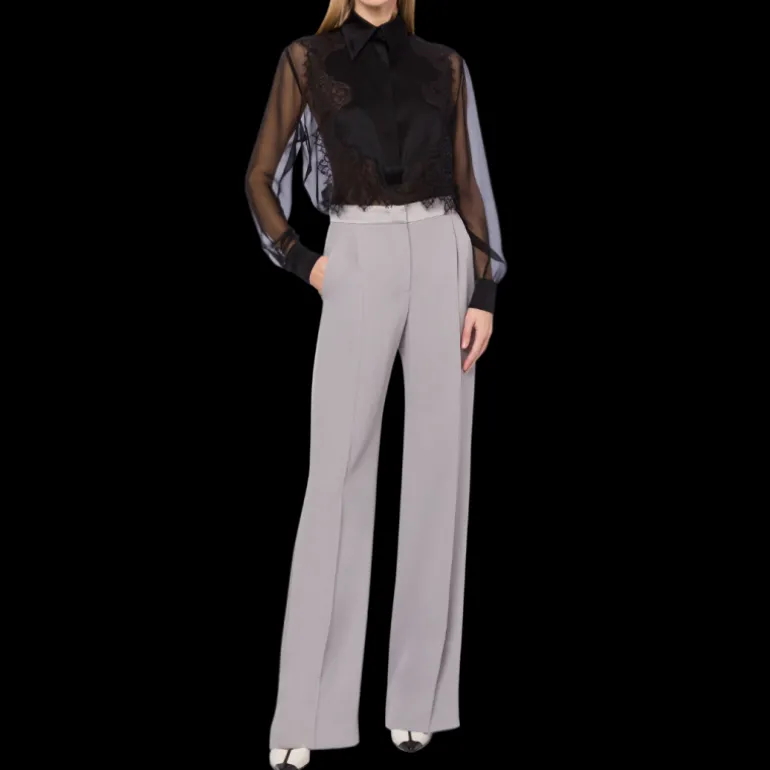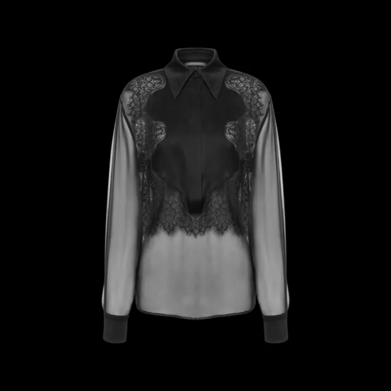 Chemise en mousseline de soie organique avec plastron en satin, encadrée de dentelle à double émeri asymétrique, au design géométrique délicat.