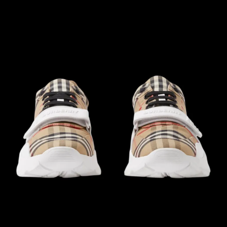Une sneaker inspirée des défilés en Burberry Check, posée sur une semelle incurvée accentuée.