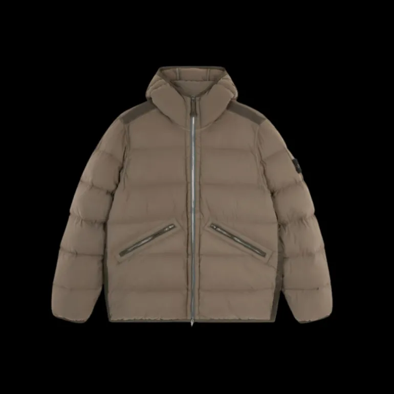 Blouson rembourré à capuche réalisé dans un tissu monocouche en nylon léger et extensible, soumis à une technique de tissage spéciale qui crée automatiquement les compartiments de plumes directement à partir du métier à tisser. Les compartiments de plumes sans couture augmentent considérablement la tenue du duvet. La pièce finie est rembourrée par injection directe avec des plumes de la plus haute qualité, traitées spécifiquement pour résister à la teinture du vêtement. Modèle teint en pièce avec l’ajout d’un agent déperlant spécial sans PFC. Certification RDS – Responsible Down Standard