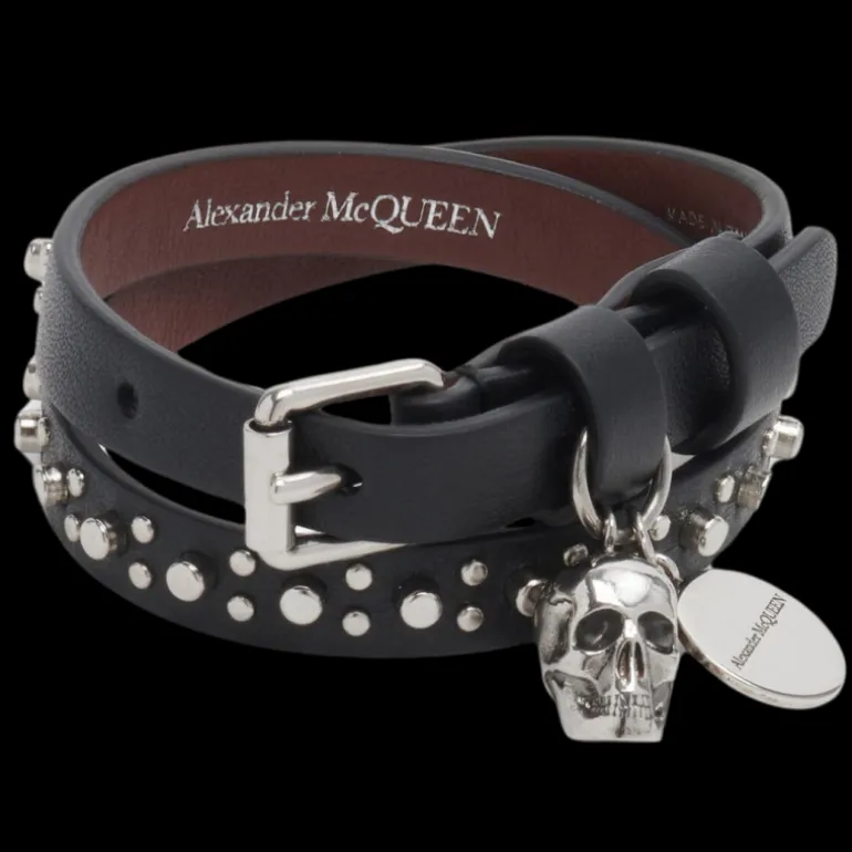 Bracelet double tour en cuir de veau noir doté de clous finition argenté antique. Ce modèle est orné d’un pendentif Skull Swarovski et d’une pièce gravée Alexander McQueen