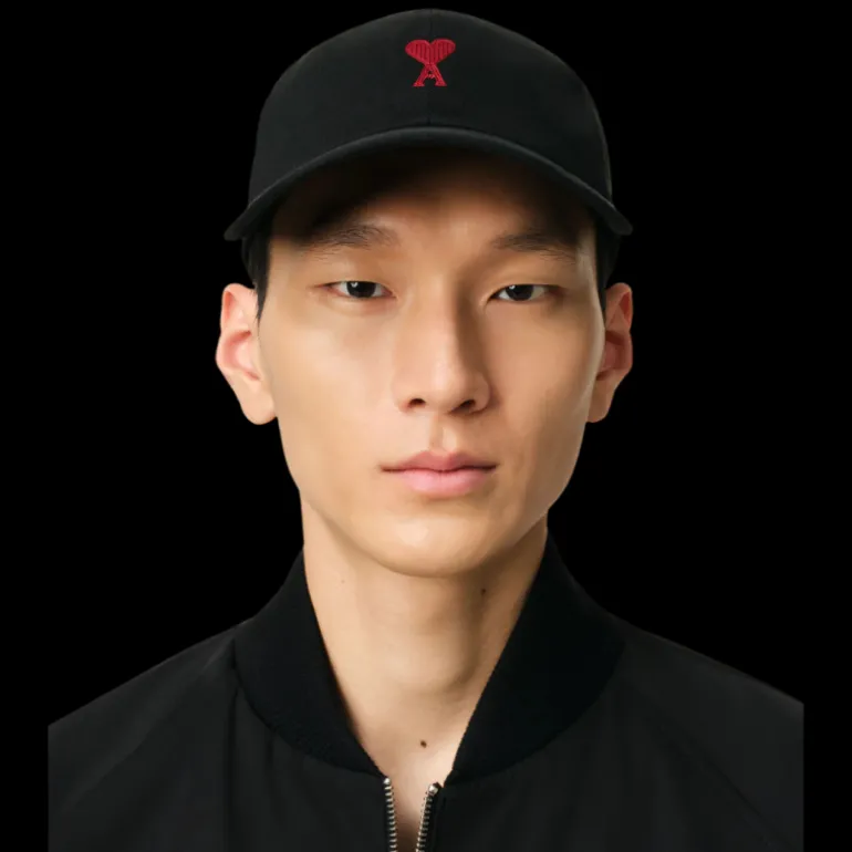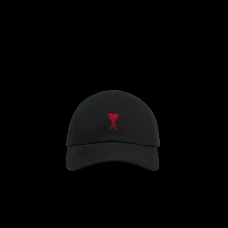 Casquette gabardine de coton peau de pêche noir broderie cœur rouge