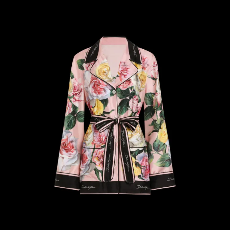 Chemise de pyjama en twill de soie avec ceinture, imprimé pivoines et roses :
