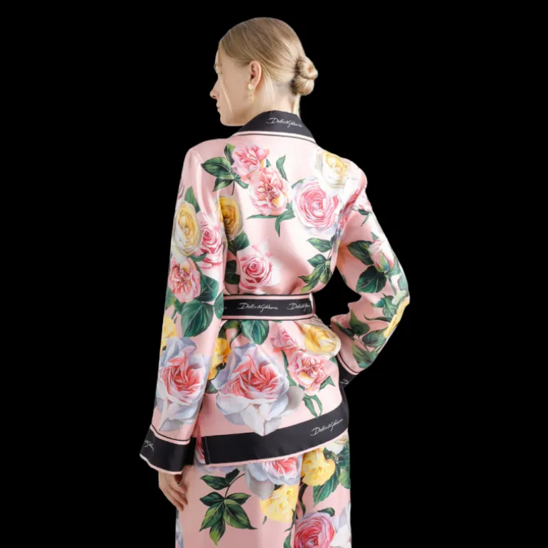 Chemise de pyjama soie twill rose imprimé floral ceinture bord noir