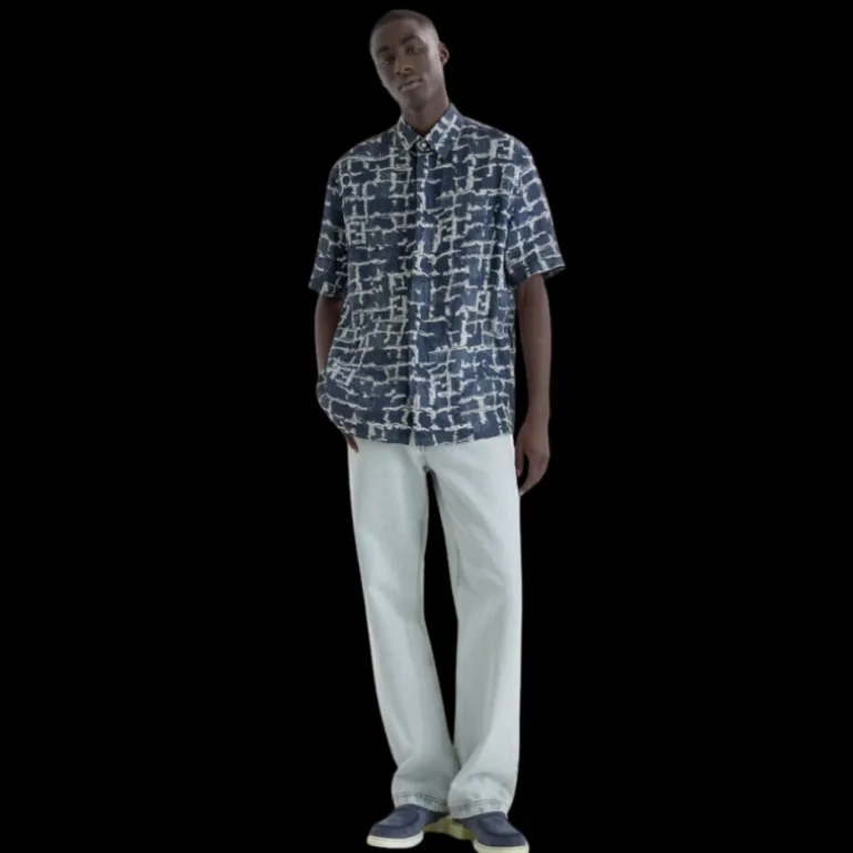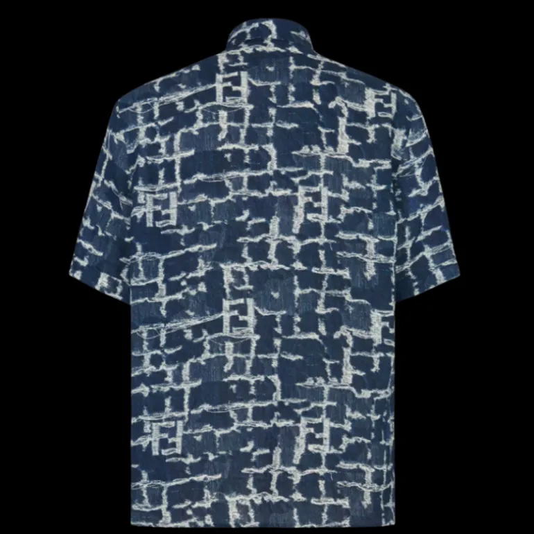 Chemise à col semi-italien et manches courtes. Modèle à coupe classique. Fermeture par boutons dissimulés. En lin à imprimé FF avec effet effrangé sur l’ensemble dans les tons bleu et blanc.