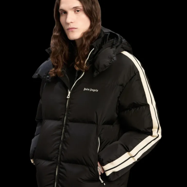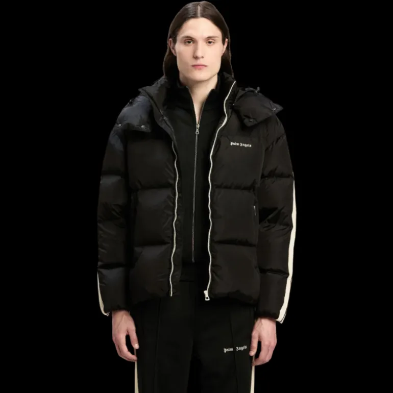 un nouveau territoire, l’outdoor, pour porter le survêtement. veste homme noir foncé avec capuche et fermeture éclair, bandes latérales écrues et logo palm angels brodé en blanc sur le devant.