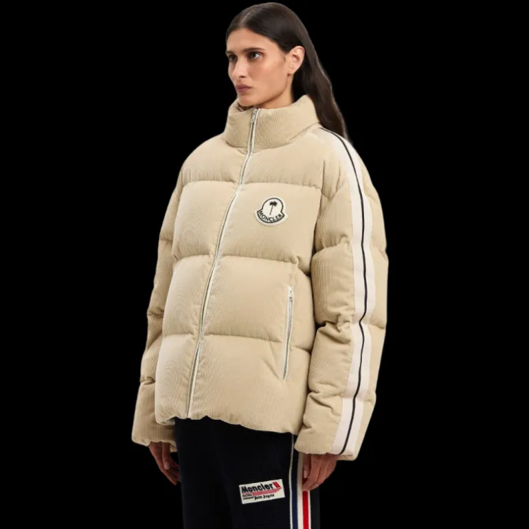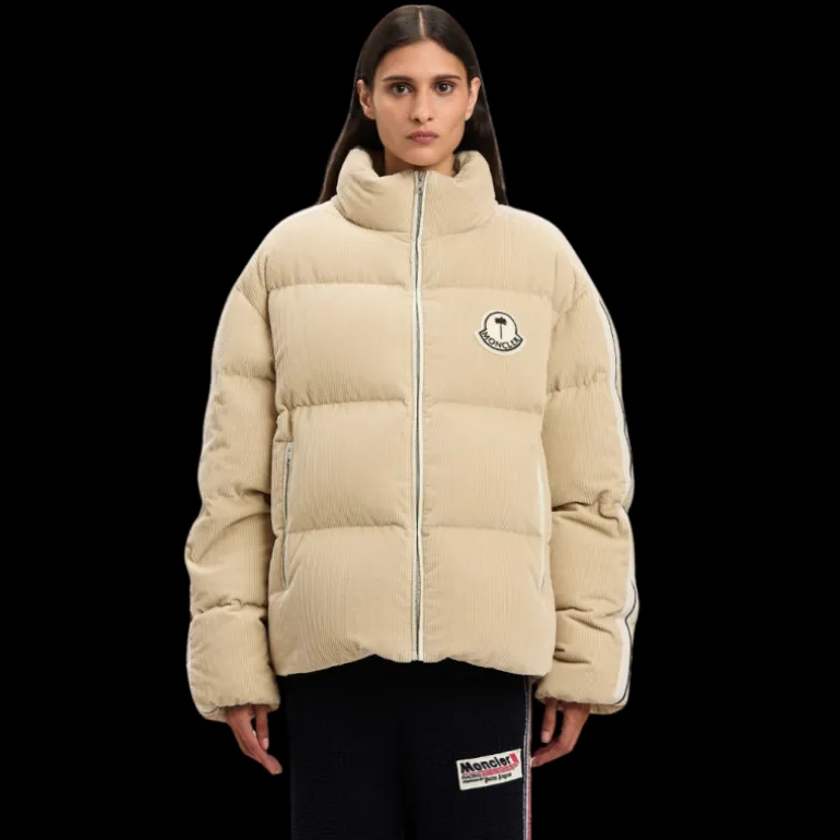 Doudoune en velours côtelé beige avec bande emblématique sur les manches, patch en éponge blanc avec palmier noir et logo Moncler sur le devant et patch blanc avec graphiques au dos.