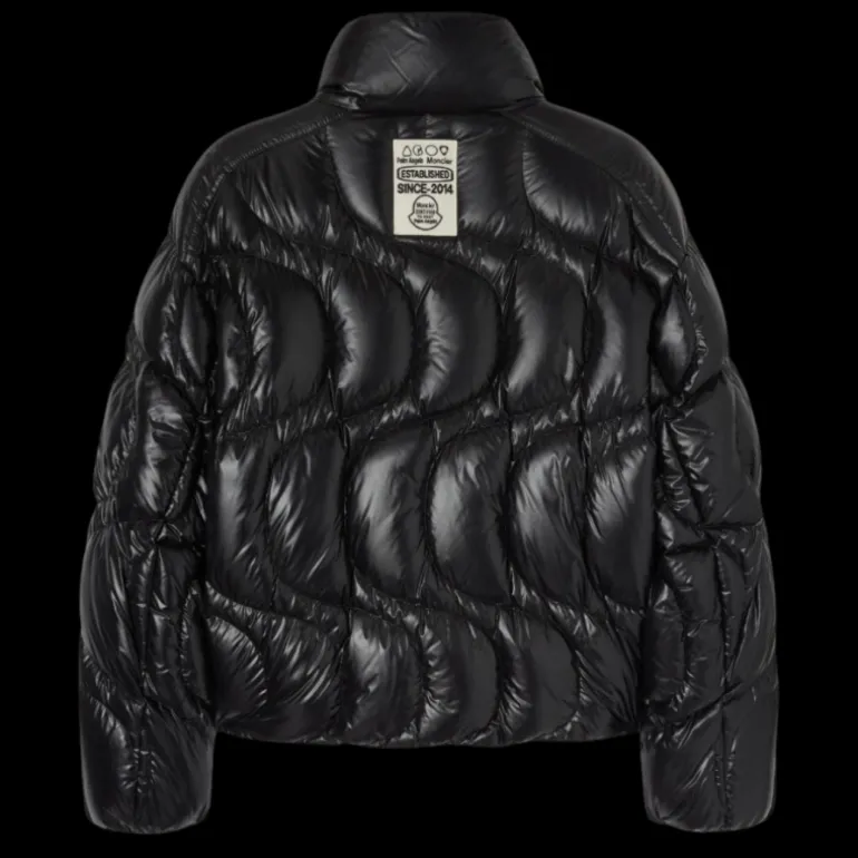 Doudoune en nylon breveté noir avec surpiqûres ondulées, application en éponge avec palmier noir et logo Moncler sur le devant, application blanche au dos, fermeture zippée et bouton-pression en métal sur le devant.