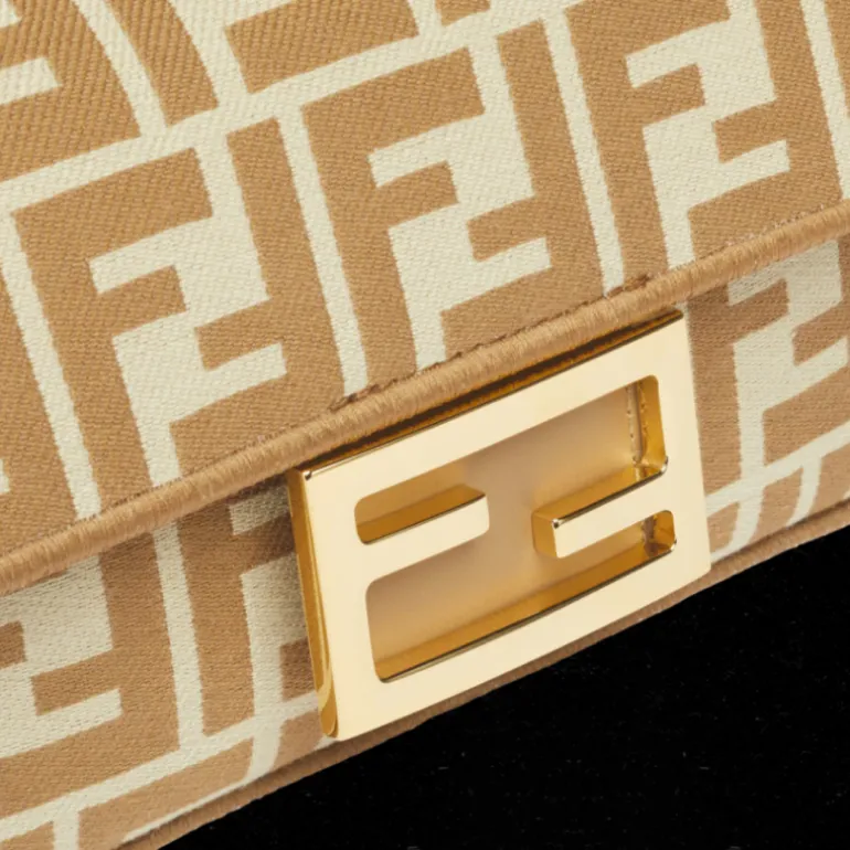 Sac iconique Baguette, petit format, réalisé en tissu jacquard avec motif FF iconique dans les tons beiges, avec bords brodés beiges, détails en cuir beige et fermoir FF.