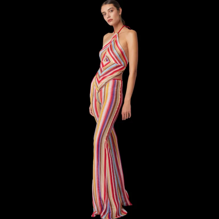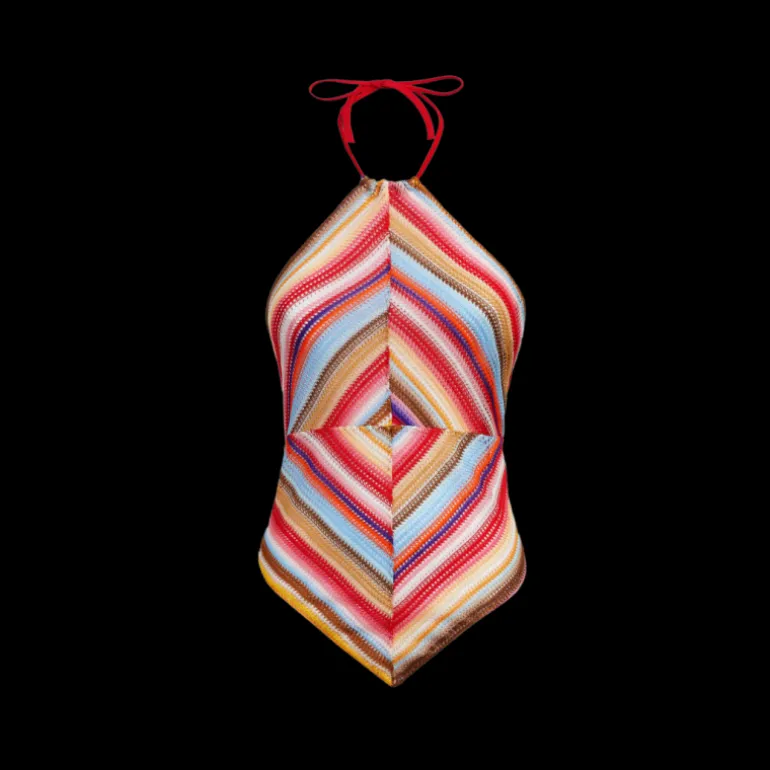 Tricot de viscose avec motif crocheté et rayé pour ce haut pour femme. Une coupe en triangle avec liens au niveau du cou caractérise ce vêtement composé en assemblant les pièces de tissu de manière à ce que le tracé des rayures soit orienté de manière discontinue.