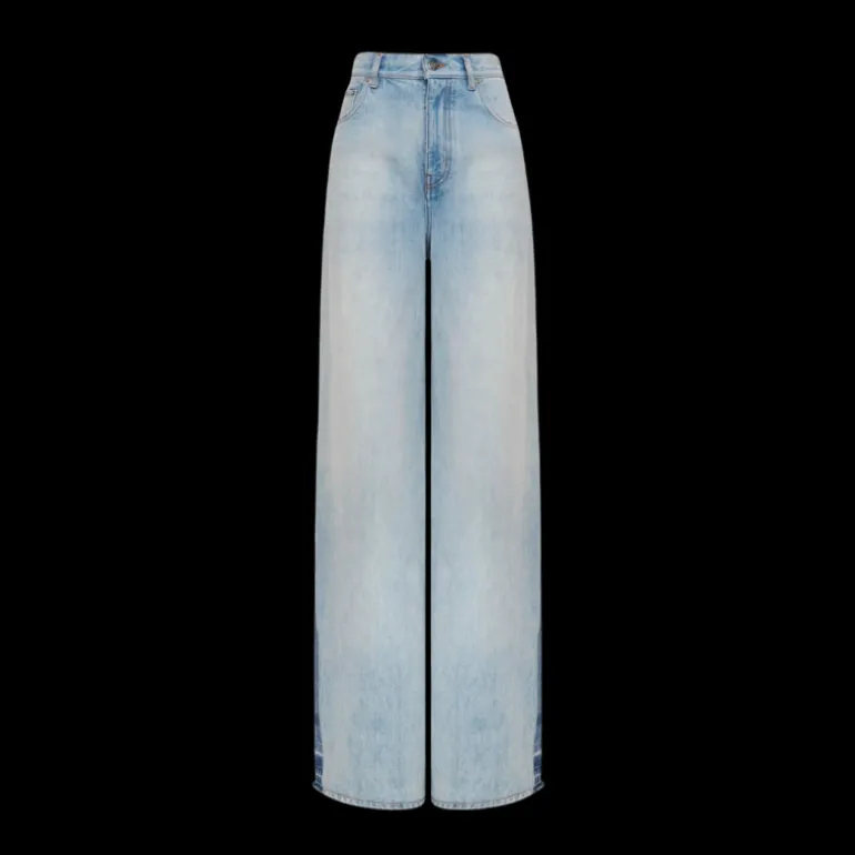 Jean palazzo large en denim souple de coton biologique « waterless » à délavage clair, avec détails d’empiècements contrastés sur les côtés.