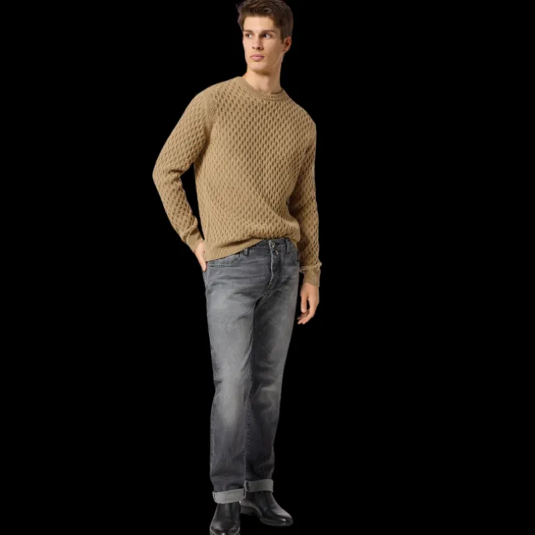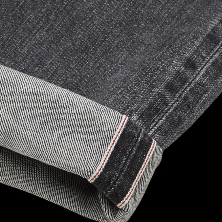 Tissu denim noir japonais selvedge en coton extensible, lavé aux enzymes, détaillé avec des moustaches et poncé à la main pour un toucher doux