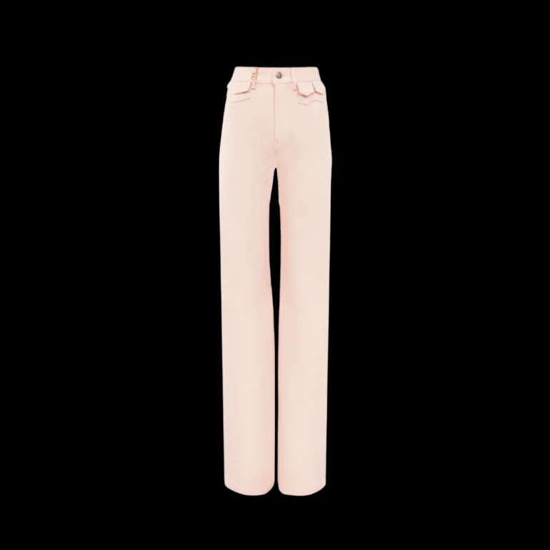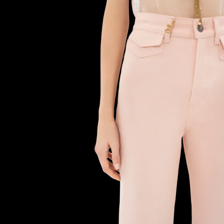 Jean taille haute évasé en denim de coton biologique teint en pièce, avec mini poches à rabat à la taille.