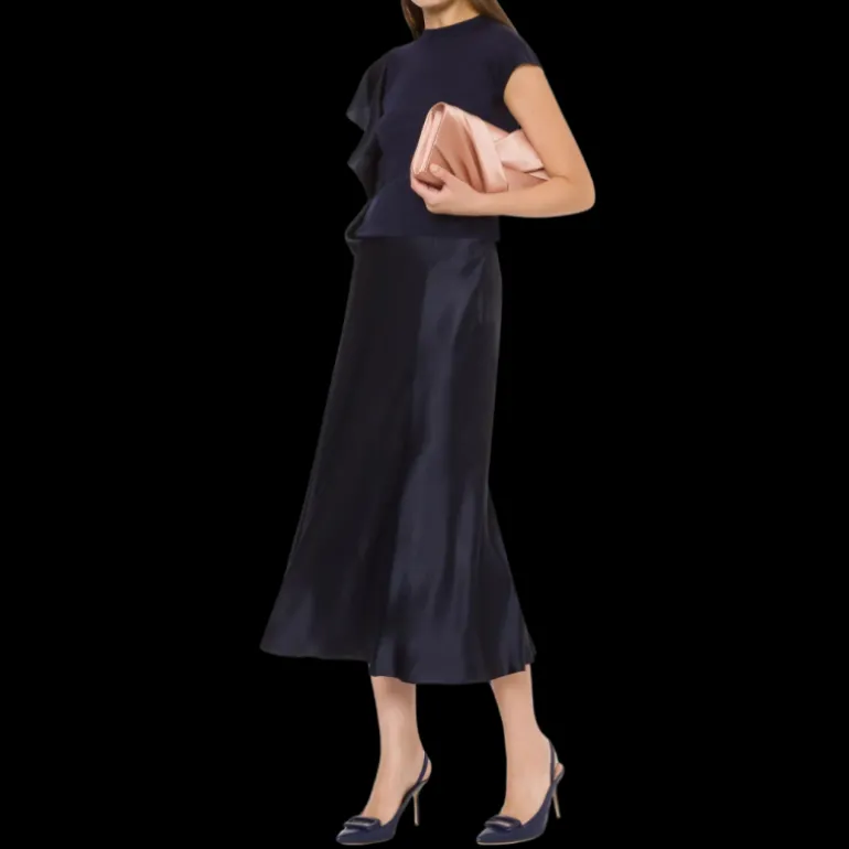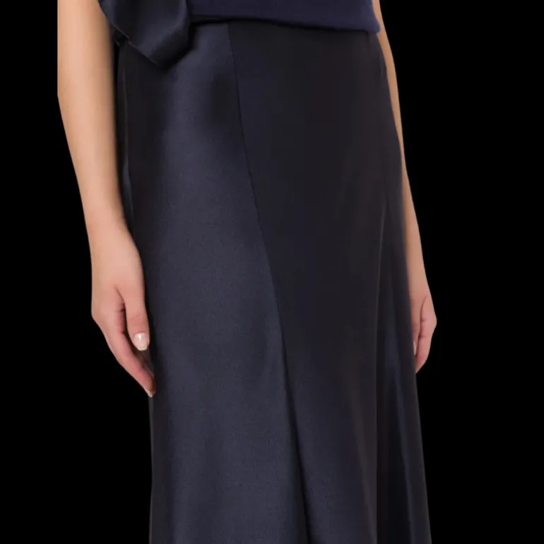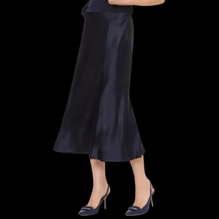 jupe droite mi-longue soie satin bleu nuit fluide évasée