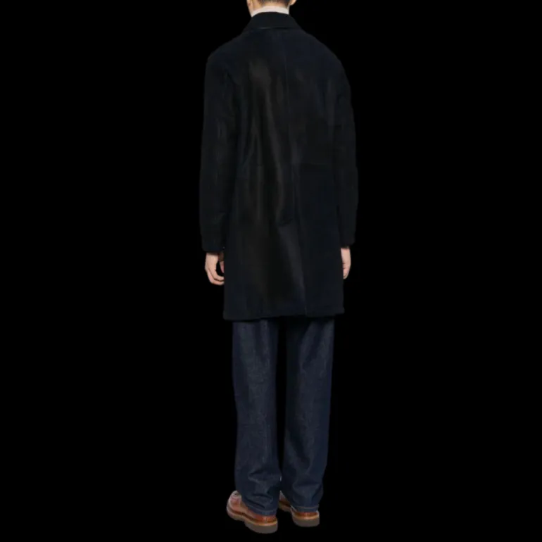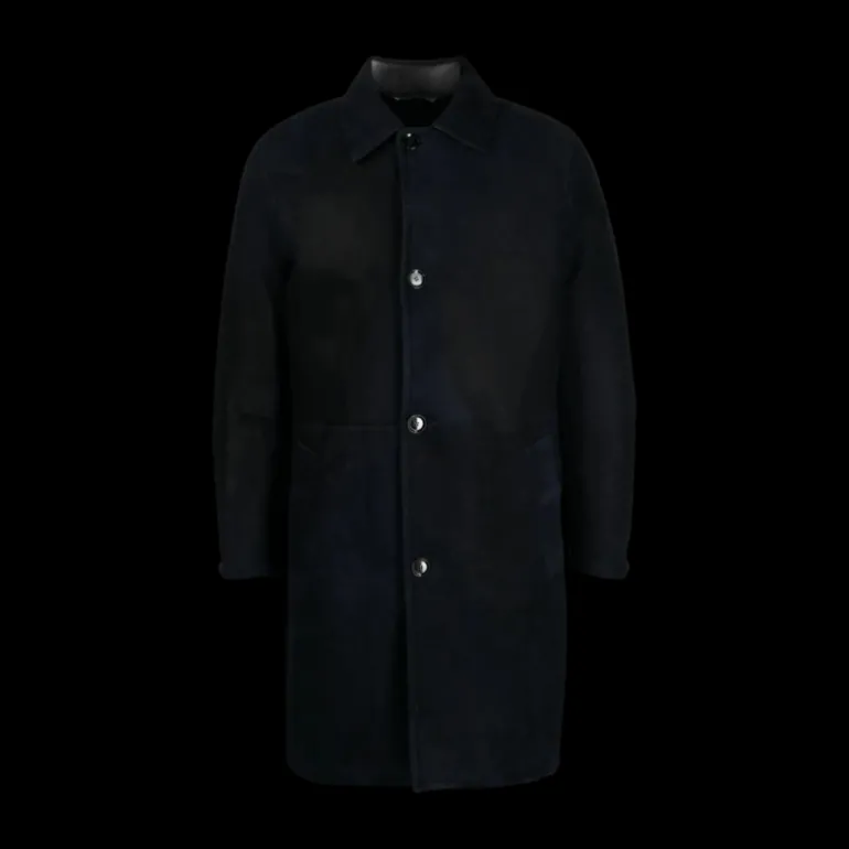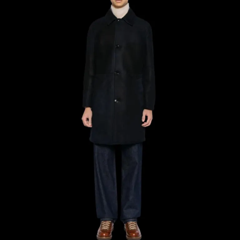Manteau droit cuir agneau shearling bleu marine