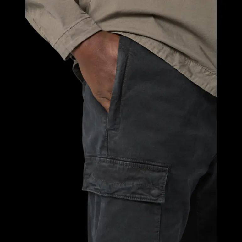 Pantalon cargo en sergé de coton biologique brisé stretch. Modèle teint en pièce avec un effet « OLD », qui est le résultat d’un procédé de teinture exclusive suivi d’un estompage sur le vêtement fini lui conférant un léger effet usé et un aspect 3D.