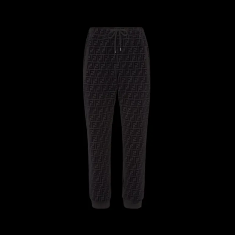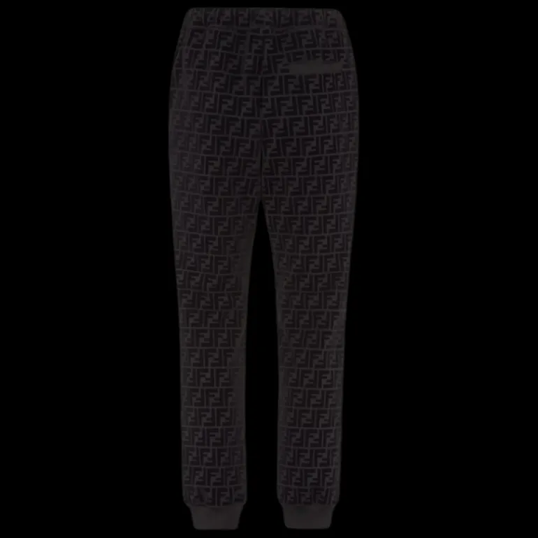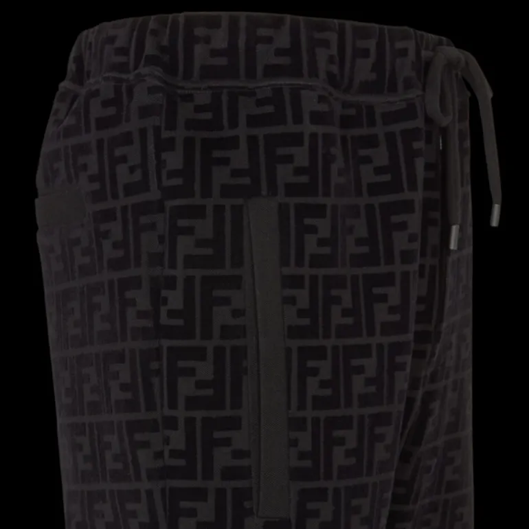 Pantalon de type jogging avec détail élastique à la taille et poches passepoilées. En piqué de coton noir. Rehaussé du motif FF floqué ton sur ton imprimé sur toute la surface.