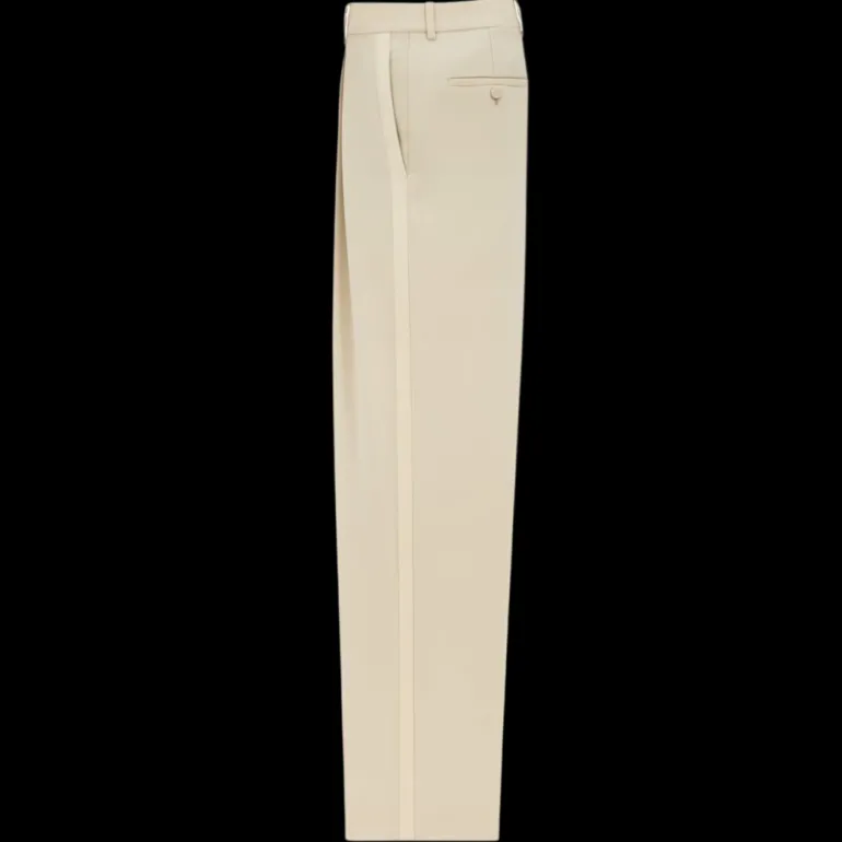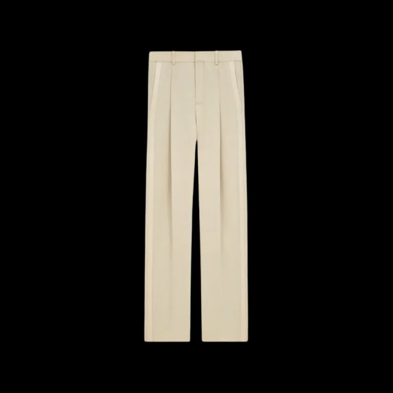 Pantalon smoking carotte taille haute beige bande satin