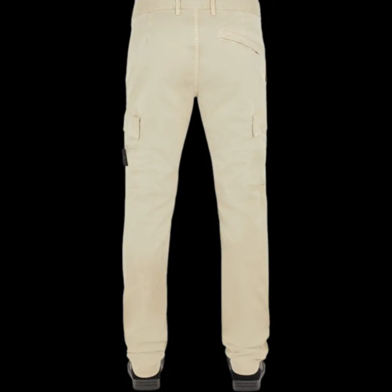 Pantalon cargo en sergé croisé de coton stretch. Modèle teint en pièce par traitement « OLD », un traitement exclusif comprenant une teinture suivie d’une décoloration pour obtenir un aspect légèrement usé et tridimensionnel.
