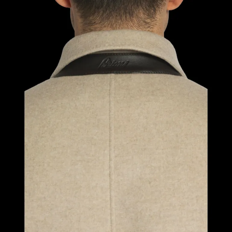 Parka en tissu double de cachemire beige. Modèle doté d’un col chemise avec patte en cuir, de cuir nappa siglé sur l’envers du col, d’une fermeture zippée à double sens sur le devant et d’une fermeture par boutons siglés dissimulée, de deux poches extérieures à rabat, d’une poche intérieure zippée et de pattes avec boutons en corne au niveau des poignets. Cette parka se caractérise par une doublure ornée d’un motif à bande régimentaire. Une pièce alliant décontraction et raffinement qui rehaussera toutes les tenues de loisirs. Ce vêtement d’extérieur présente notre tissu double emblématique : dans cette construction, deux tissus distincts sont minutieusement cousus ensemble de manière invisible pour obtenir l’esthétique et la fluidité d’un seul tissu. Les bordures sont finies à la main par les meilleurs artisans, mettant en valeur le meilleur du savoir-faire vestimentaire.