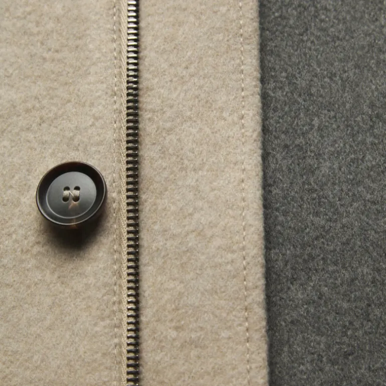 Fermeture zippée à double sens et par boutons en corne dissimulés sur le devant