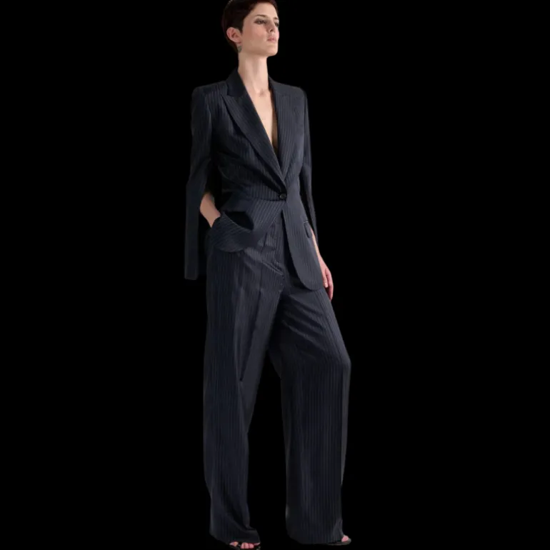 Proposé dans un twill de soie fluide et léger, ce pantalon à jambes larges joue sur les détournements avec audace. La soie imprimée revisite le tissage rayé des costumes italiens masculins pour en proposer une version féminine au confort incomparable. Doté des mêmes finitions tailleurs que nos pantalons de costume classiques, ce modèle tendance s’accorde aussi bien à la veste assortie qu’au débardeur en soie rayée pour un total look revisité.