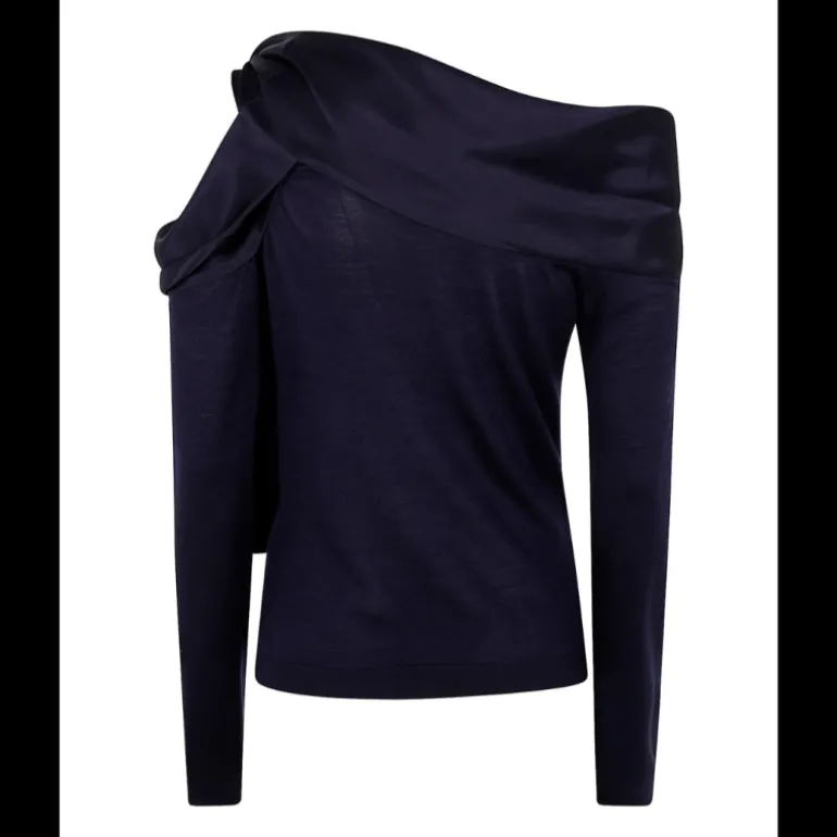 Pull col asymétrique cachemire laine soie bleu marine nœud satin