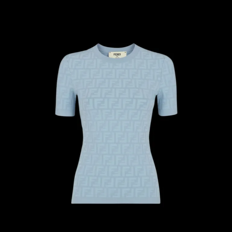 En maille de viscose, avec motif FF en relief sur l’ensemble dans les tons bleu clair.