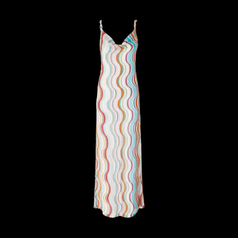 Missoni joue avec la sensualité de la nature et propose une robe cache-cœur longue au travail raffiné en raschel. La silhouette fluide, le dos ouvert et les fentes latérales sur la jupe confèrent à la pièce une touche de sensualité classique, qui devient irrévérencieuse grâce au motif à vagues agrémenté des reflets métalliques du lurex.