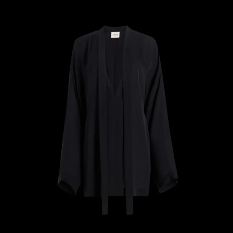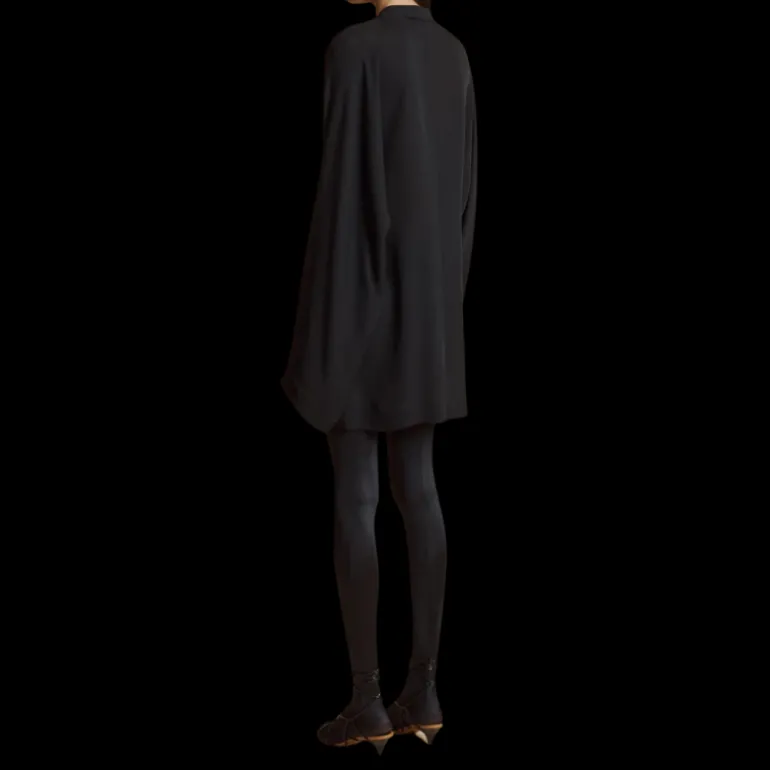 Une silhouette fluide en georgette choisie pour sa souplesse et son opacité. Animée par des manches arrondies et allongées. Fentes à l’encolure pour fixer la cravate.