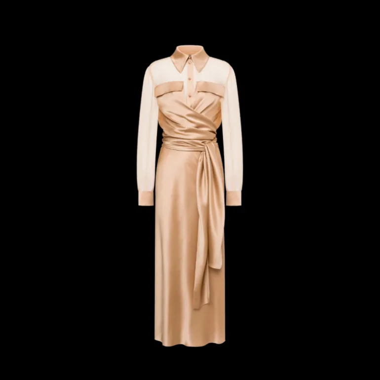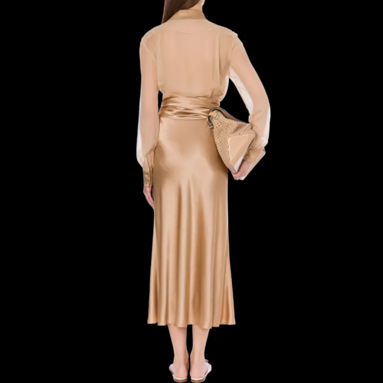Robe longue soie beige rosé col chemise poignet satin