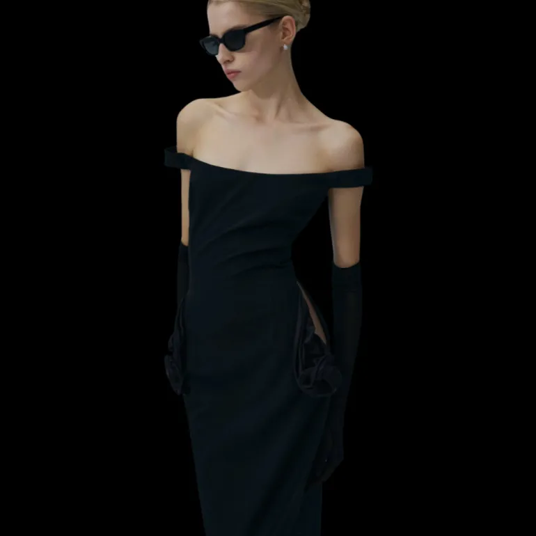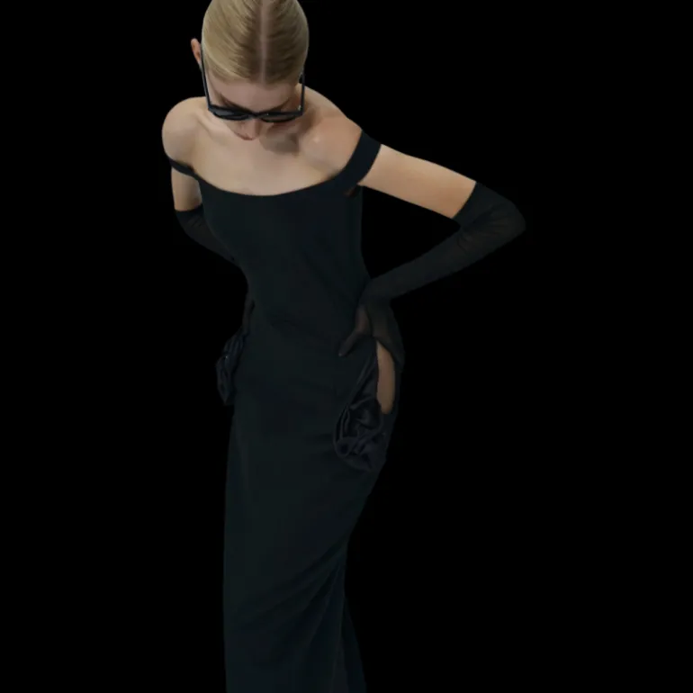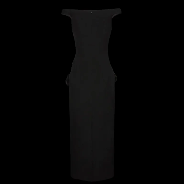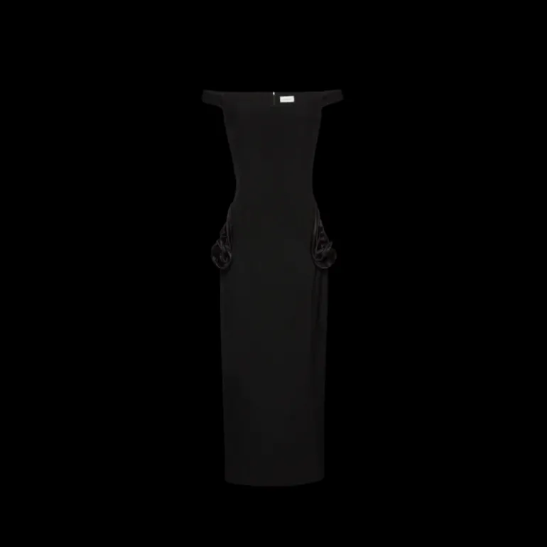 Une robe midi ajustée à épaules dénudées avec des découpes circulaires au niveau des hanches, qui sont en outre ornées d’appliqués de roses.