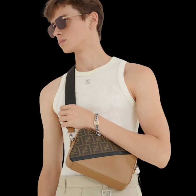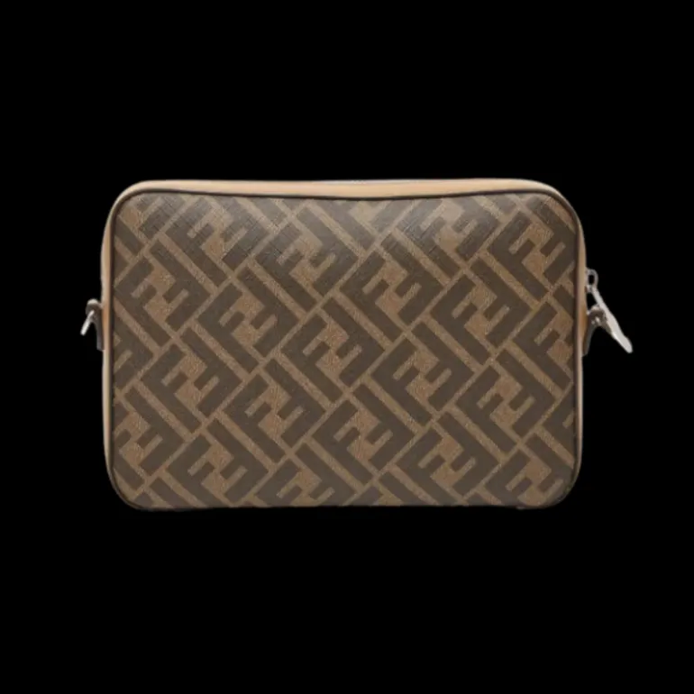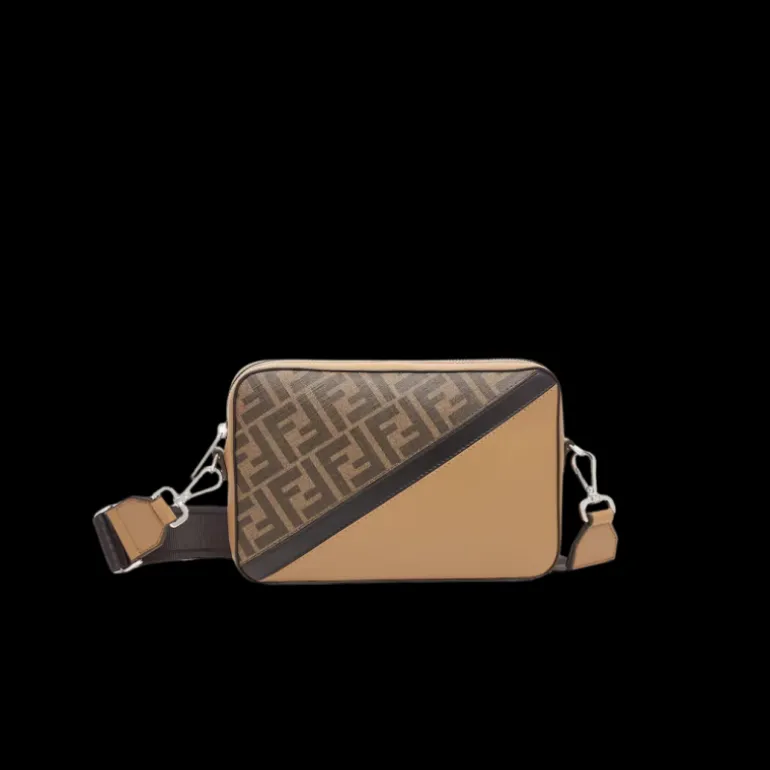 Sac bandoulière compact cuir beige tissu motif FF diagonal