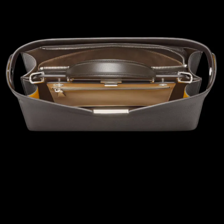 Sac Peekaboo ISeeU, moyen modèle, réalisé en cuir Cuoio Romano marron foncé avec intérieur contrasté jaune.