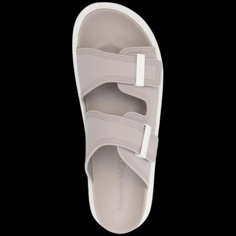 Gris clair, fermeture scratch sur le devant, semelle intérieure à logo, bout ouvert, semelle plate en caoutchouc.