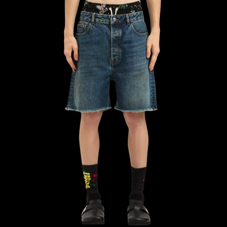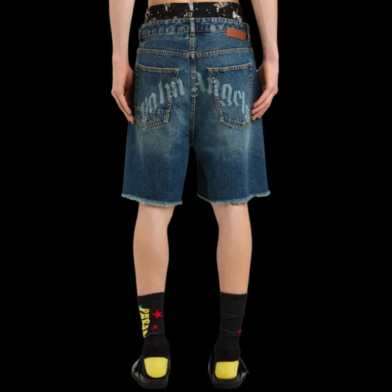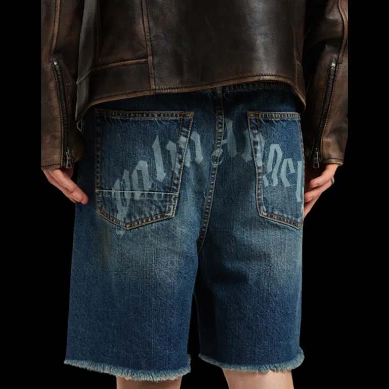 Short à franges coton jean bleu logo incurvé gravé laser dos