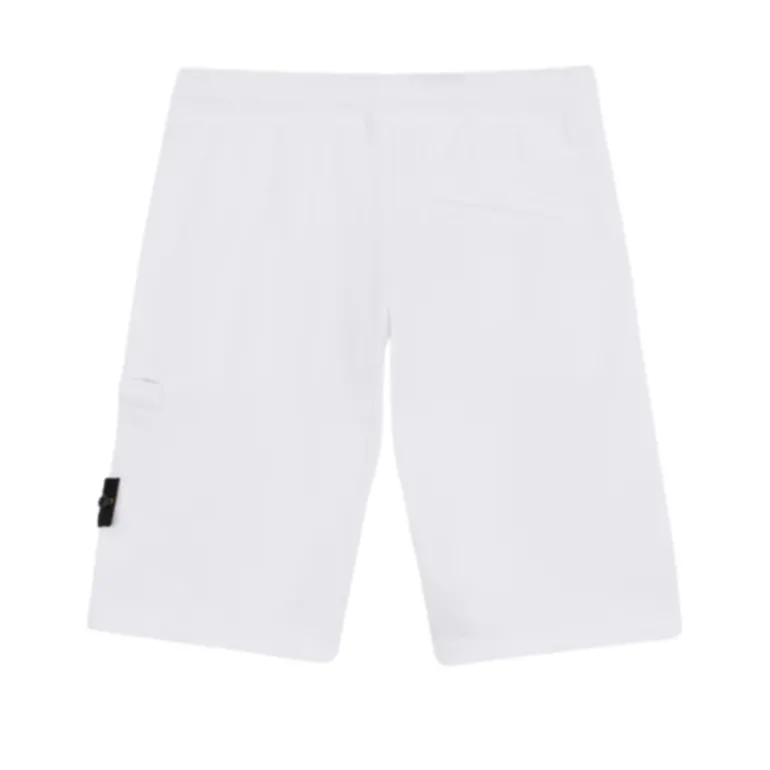 Bermuda cargo en molleton de coton biologique avec poches mains, poche fendue pressionnée au dos, poche plaquée sur la jambe gauche et taille élastiquée à cordon de serrage. Modèle teint en pièce.