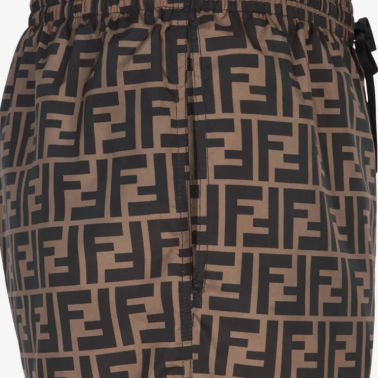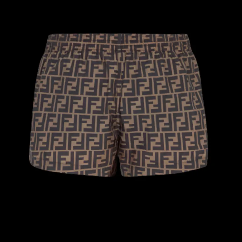 Short de bain avec taille élastique et cordon de serrage. Réalisé en tissu vitrifié avec motif FF dans des tons marron.