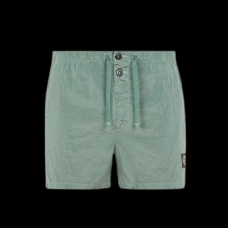 NYLON METAL IN ECONYL® REGENERATED NYLON : Maillot de bain réalisé à partir d’un nouveau tissu responsable Stone Island Nylon Metal irisé. L’évolution de ce tissu iconique implique l’utilisation de fils régénérés ECONYL® : en fin de vie, le nylon pré/post-consommation est recyclé selon un processus complexe de dépolymérisation pour réaliser ce fil qui présente les mêmes caractéristiques intrinsèques que le nylon dont la matière première est issue de l’énergie fossile. Le tissu est résiné à l’intérieur pour une protection contre le vent et légèrement déperlante. Le modèle fini est soumis à un traitement avancé de teinture à deux solutions.