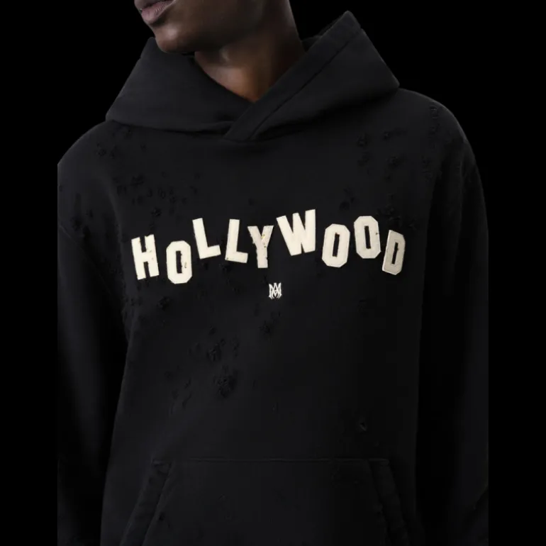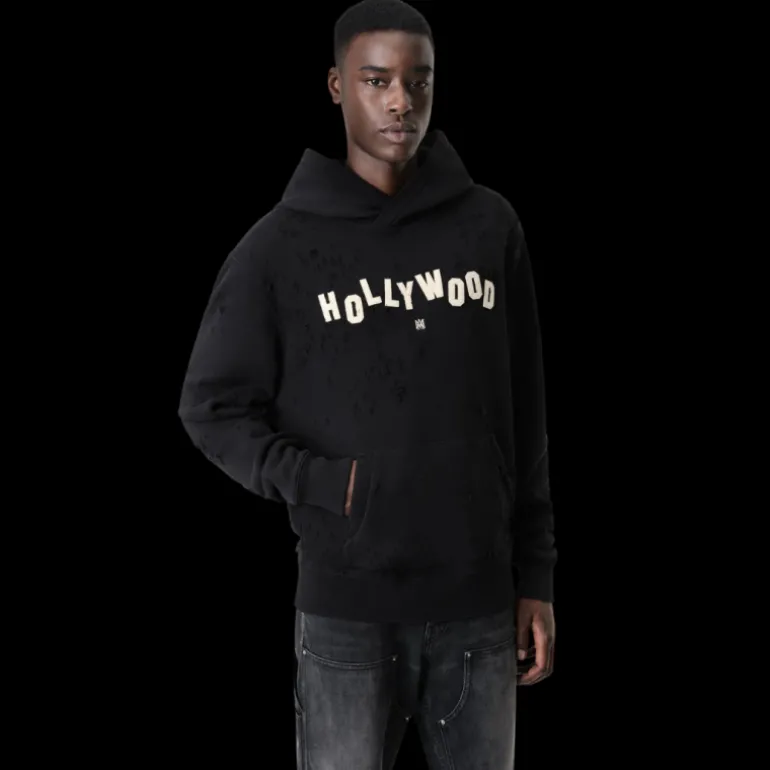 Pour l’automne-hiver 2024, l’emblématique panneau Hollywood s’impose comme un symbole durable de la ville d’AMIRI, LA, et de l’art du cinéma. Le sweat à capuche Hollywood Shotgun en coton est spécialement vieilli et arbore le motif Hollywood de la saison en application de feutre avec l’icône MA brodée.