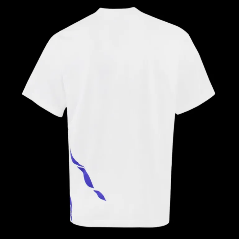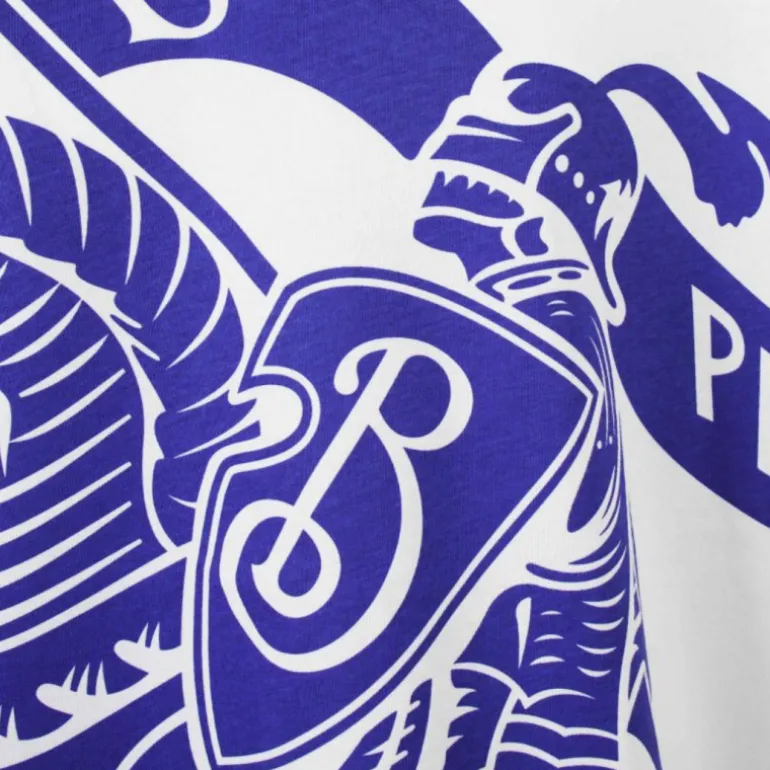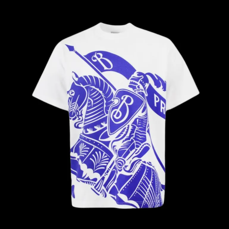 Un T-shirt blanc orné d’un imprimé chevalier équestre en bleu