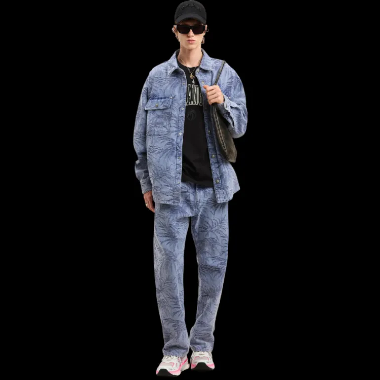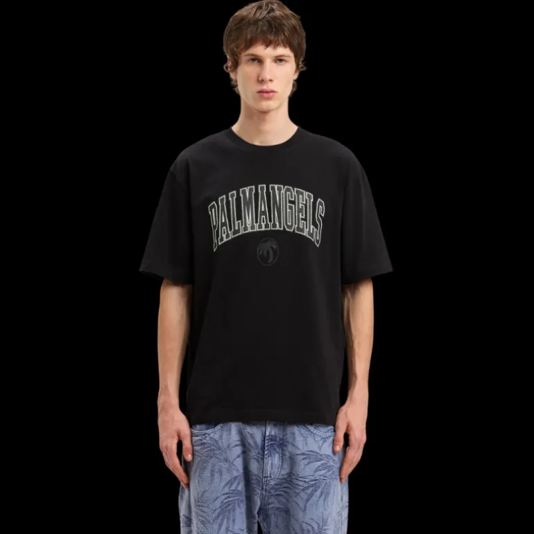 L’esthétique universitaire appliquée aux icônes clés donne un nouveau souffle. T-shirt slim noir pour homme avec logo vintage noir de style universitaire et palmier ovale imprimé sur le devant.