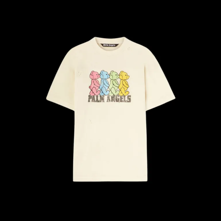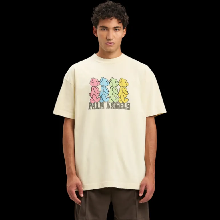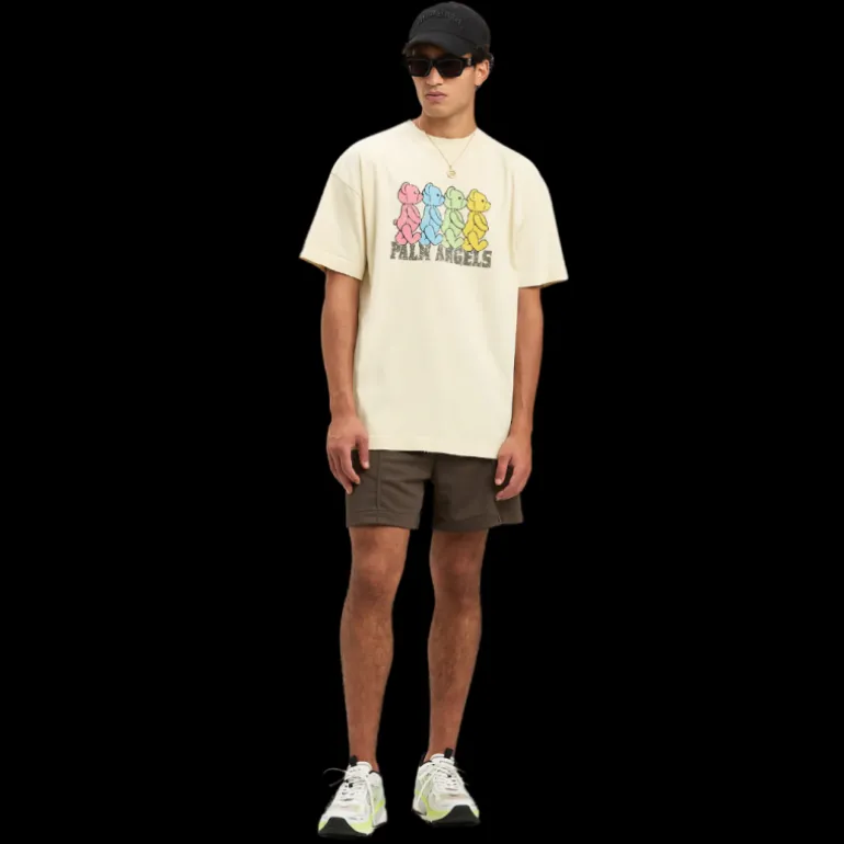 Des références iconiques, pour un graphisme ludique autour d’un des personnages emblématiques de Palm Angels. T-shirt homme à manches courtes couleur ivoire avec des oursons multicolores traversant la route imprimés sur le devant.