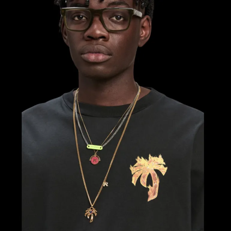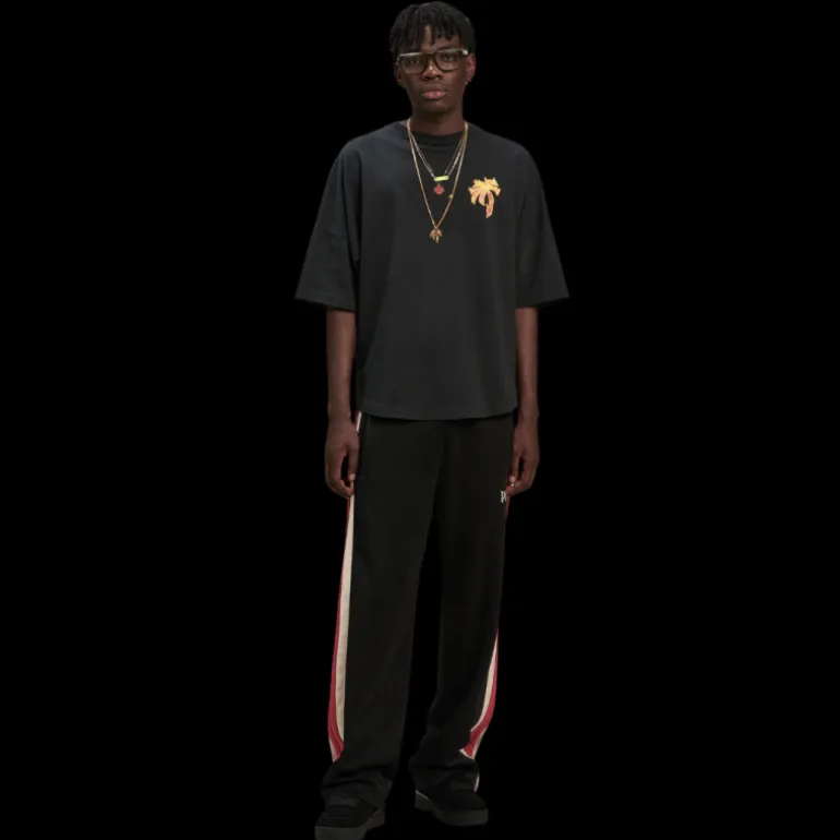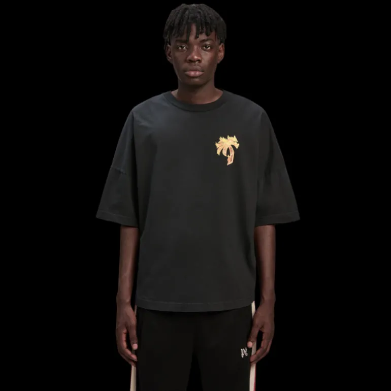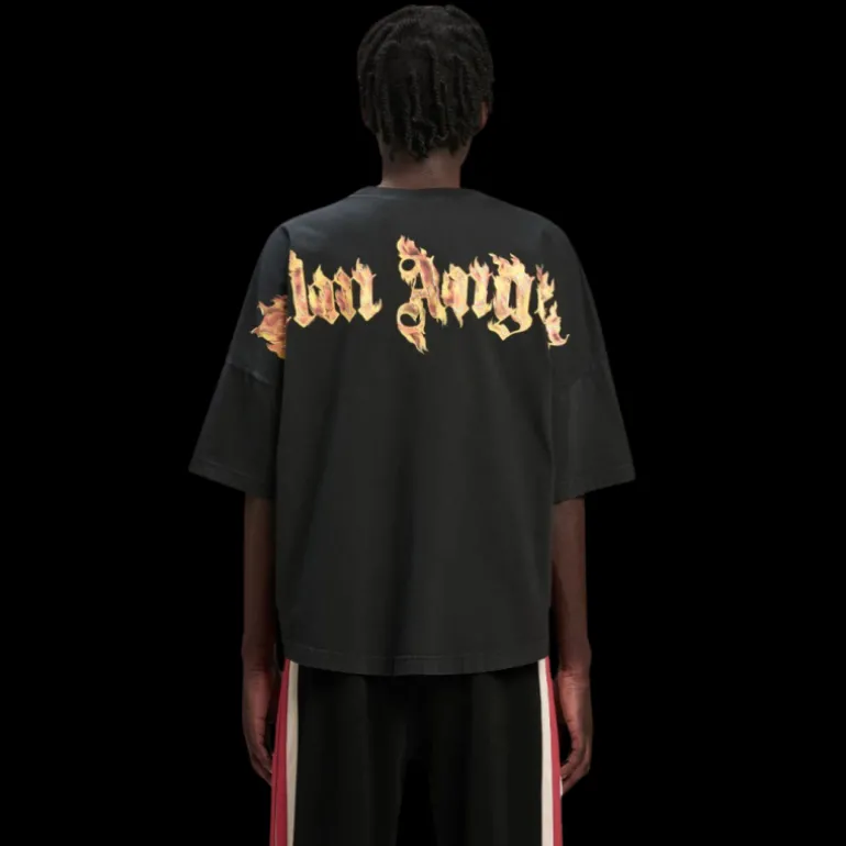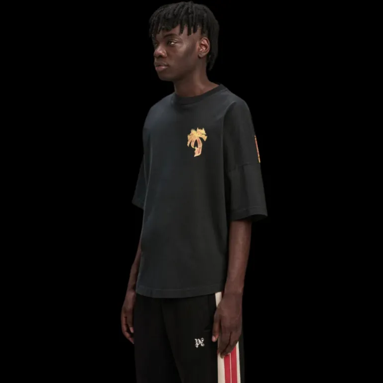 l’une des décorations les plus appréciées, les flammes brûlantes, revient dans une version dorée et enveloppe également le logo gothique. t-shirt noir pour homme avec coupe over fit et manches tombantes avec palmier avec flammes dorées imprimées sur le devant et logo palm angels enveloppé de flammes imprimé sur les épaules.