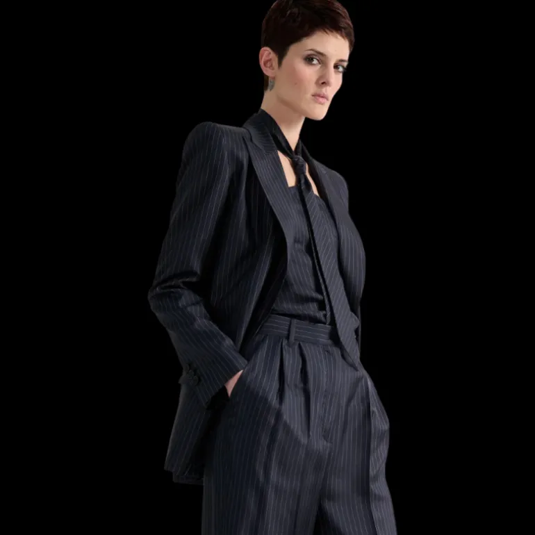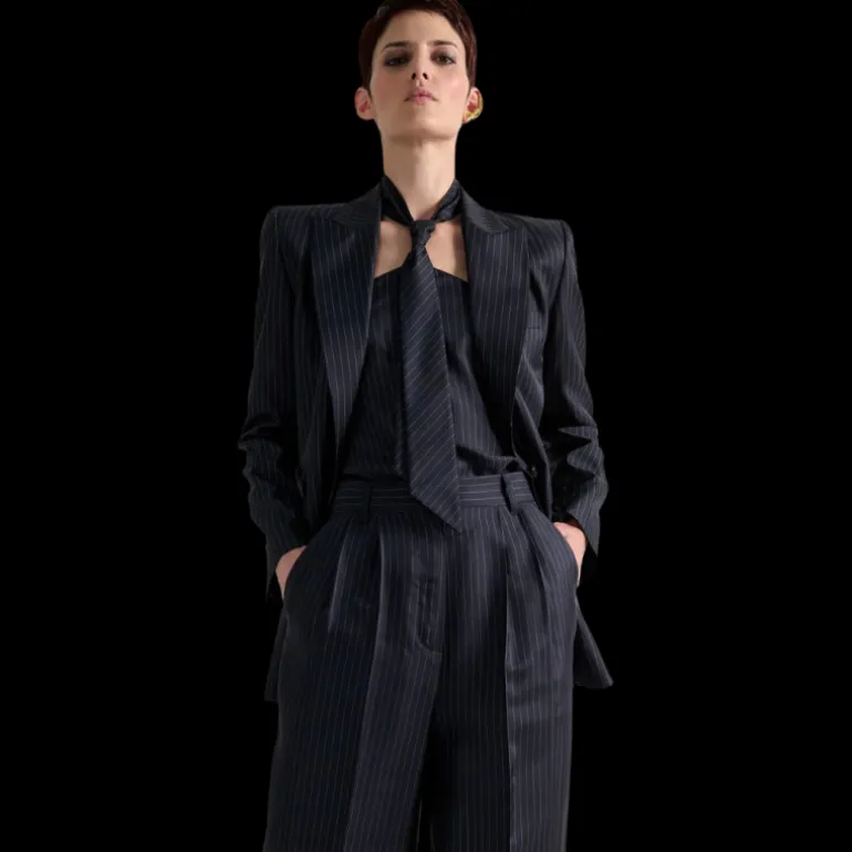Incarnation du mélange des genres cher à Barbara Bui, ce top en soie comporte une cravate intégrée pour une allure androgyne qui ne manque pas de féminité. Retenue par un petit col doté de 2 boutons, ce top révèle un dos nu à la sensualité affirmée. La soie marine rayée s’inspire des costumes italiens auxquels elle prête sa douceur et sa fluidité. Porté en total look avec le pantalon et la veste de costume assortis, ce top cravate signe une allure « sharp and cut », du jour au soir.