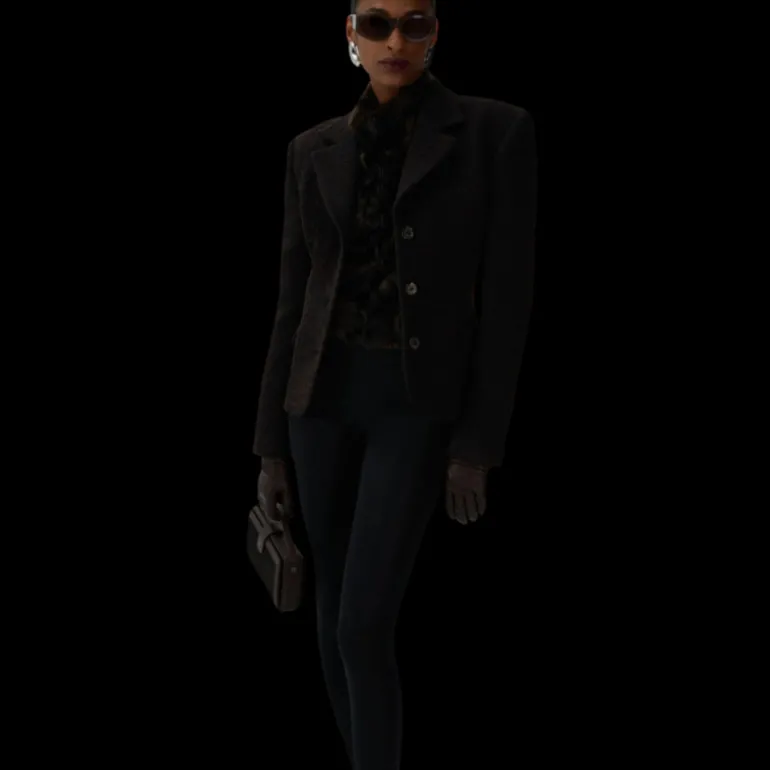 Un blazer ajusté en laine à la silhouette classique, doté d’une fermeture à un seul bouton en corne, de revers traditionnels et d’une taille cintrée, tombant jusqu’aux hanches.