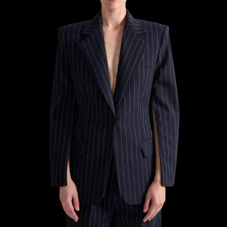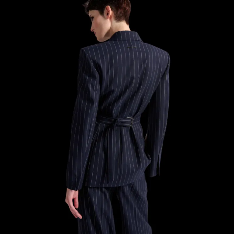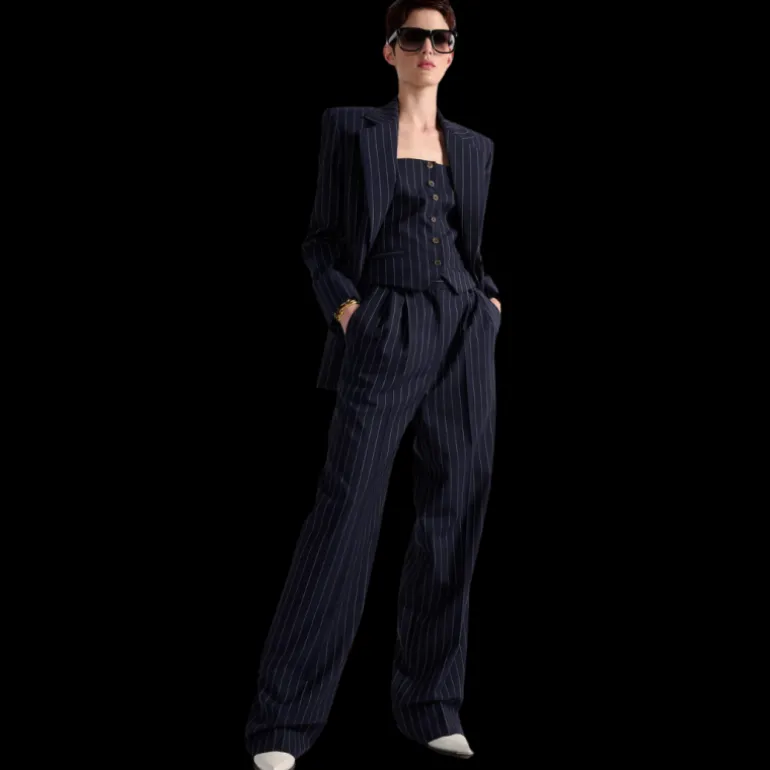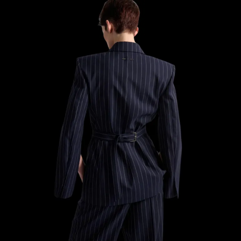 Pour une esthétique chic et urbaine inspirée du tailoring masculin, Barbara Bui a imaginé cette veste de costume pour femme à rayure tennis. Sa carrure prononcée et sa taille parfaitement cintrée soulignent l’art de la coupe de la House et l’équilibre parfait des volumes. Pilier d’une allure androgyne signature, cette veste ceinturée, portée en costume-trois-pièces revisité, s’associe au bustier et au pantalon taille haute à plis assortis.