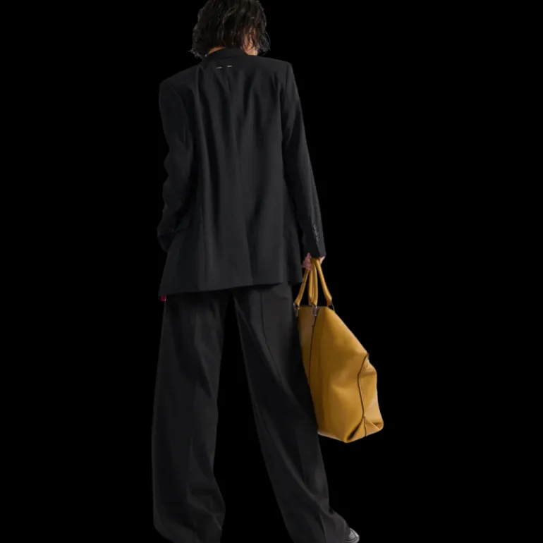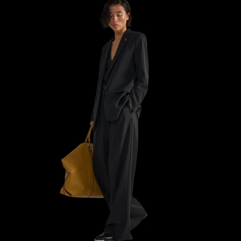 Cette veste de costume droite à la coupe boyfriend est proposée dans une toile de laine stretch en coloris noir ou violet. Elle se porte à sa taille pour une silhouette aux volumes maîtrisés mais peut également être surtaillée d’une ou plusieurs tailles afin d’obtenir un volume oversize volontairement exagéré. Se fermant à l’aide d’un bouton, cette veste dispose d’une patte de rappel permettant de l’entrouvrir tout en lui assurant un tombé impeccable. Détail rock, sa boutonnière milanaise s’orne d’un passant en métal siglé Barbara Bui. Associée au gilet de costume et au pantalon taille basse assorti, cette veste renouvelle les propositions de costumes-trois-pièce.