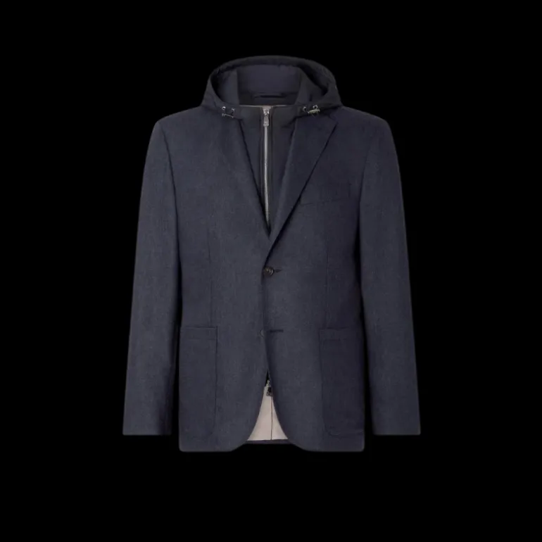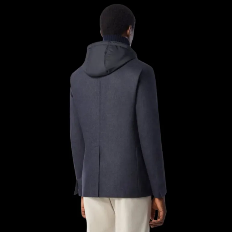 Veste droite 2 boutons flanelle stretch laine cachemire bleu marine capuche