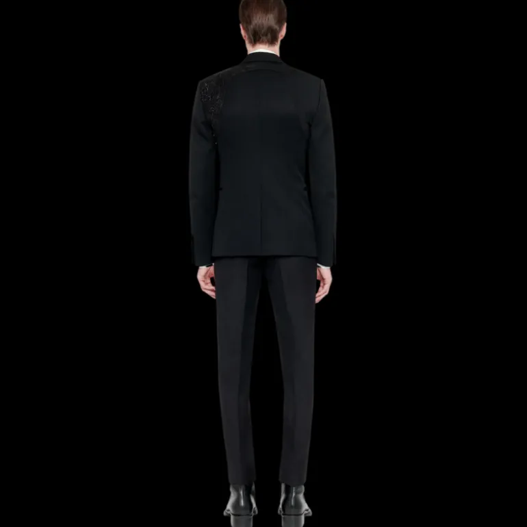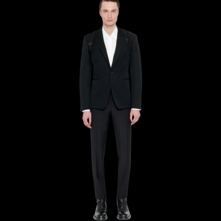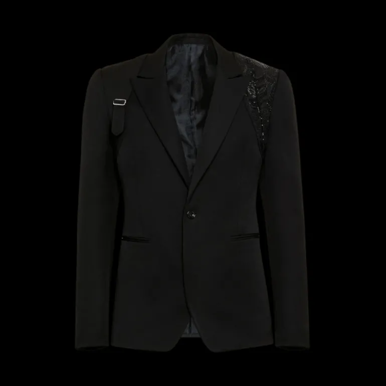 Veste à boutonnage simple en grain de poudre noir avec harnais et broderie Collage ton sur ton