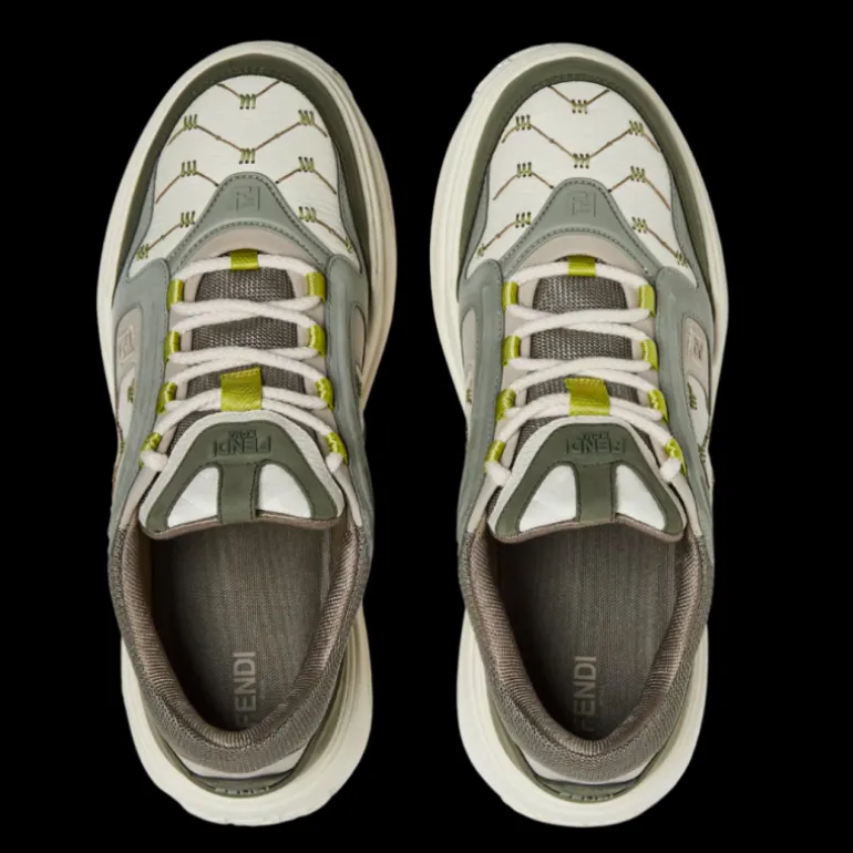 Chaussures basses à lacets Fendi Force. En cuir grainé blanc et nubuck gris et vert foncé. Broderie sur la tige, finition avec grands points Selleria contrastés cousus main, un emblème de la finition iconique Selleria que les artisans Fendi perpétuent depuis 1925. Détails en tissu technique vert et vert acidulé. Semelle épaisse et légère en caoutchouc blanc avec motif FF sur le bout et le talon.